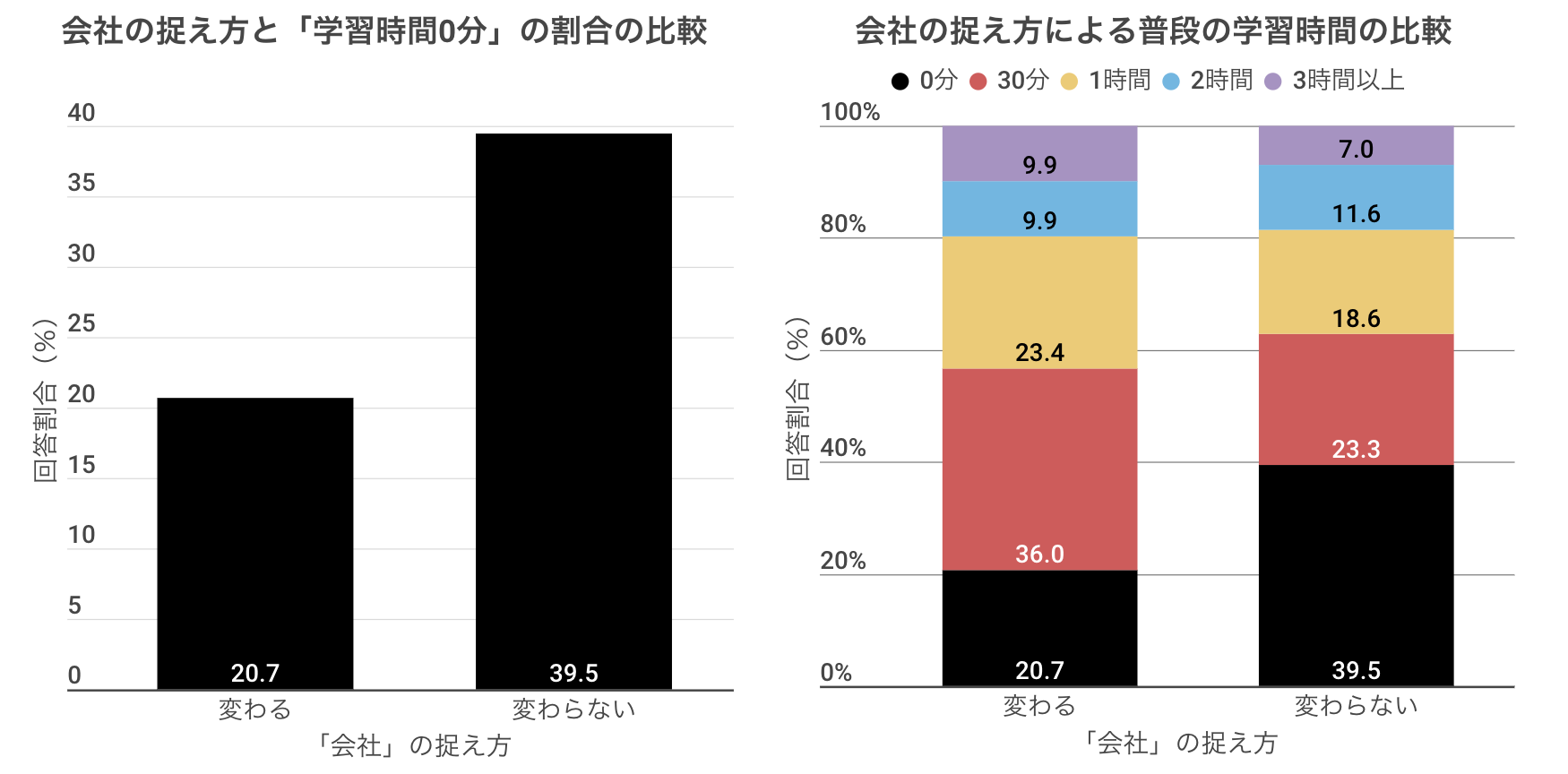 その結果、「会社風土は変化しないもの」と信じているグループでは「学習時間0分」という回答割合が約40%なのに対して、「会社風土は変化していくもの」と信じているグループでは約20%と大きなギャップがあることがわかりました。「会社は変わらない」と思っている人にとっては、学び続けることの価値が低くなってしまうのでしょうか。