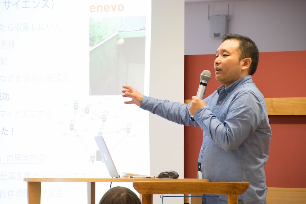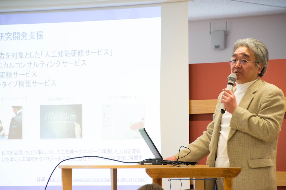 毎月開催している経営者向けのAI活用セミナーが即満席になるという株式会社クラスキャットの佐々木さん。経営者を対象にした「人工知能研修サービス」を展開しています。今回は、企業の中で、どうやってAIを取り込んでいくか?を発表してくれました。