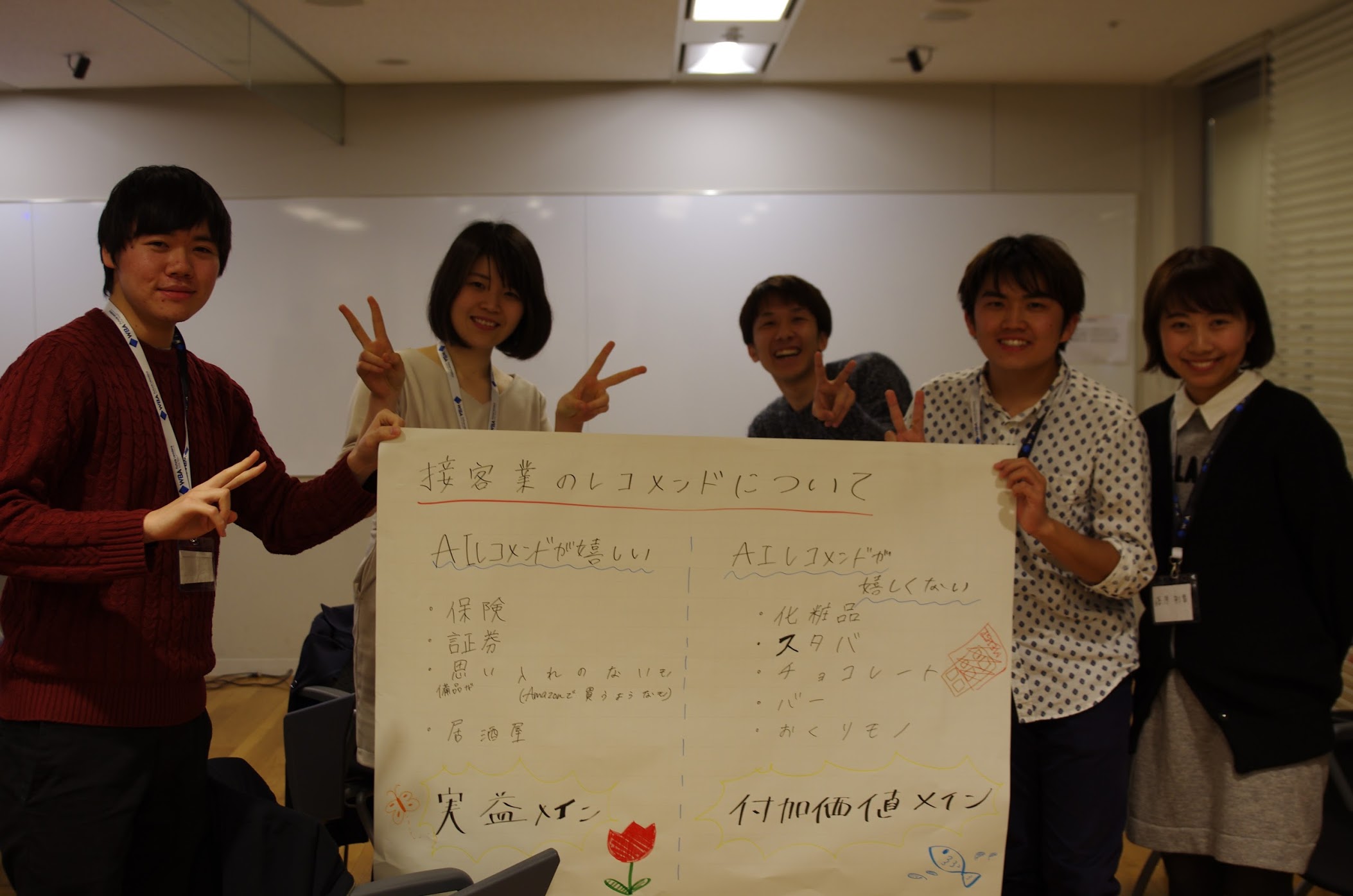 人間が説明する必要がある複雑な商品、オペレーションが明確なホール業務などが無くなると予想。面白い考察として、AIにされて嬉しくないことも考えていた所が他チームと異なっていたポイント、例えば、スタバ・贈り物・化粧品など付加価値が対価になっている接客はAIではなく人間の方が価値が高いと判断していました。
