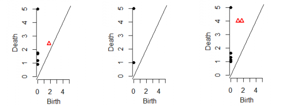 新しい穴ができる位置をbirth、穴がなくなっちゃう時をdeathにするとこんなグラフができる。