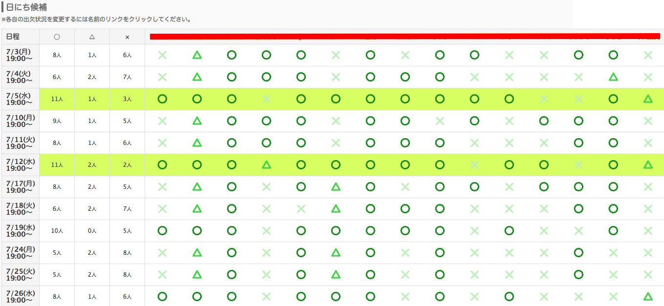 こんな感じで自動的に参加できる人数が多い日程に色がつくので、候補を絞りやすいです。個人的にもちょくちょく利用させてもらっています。