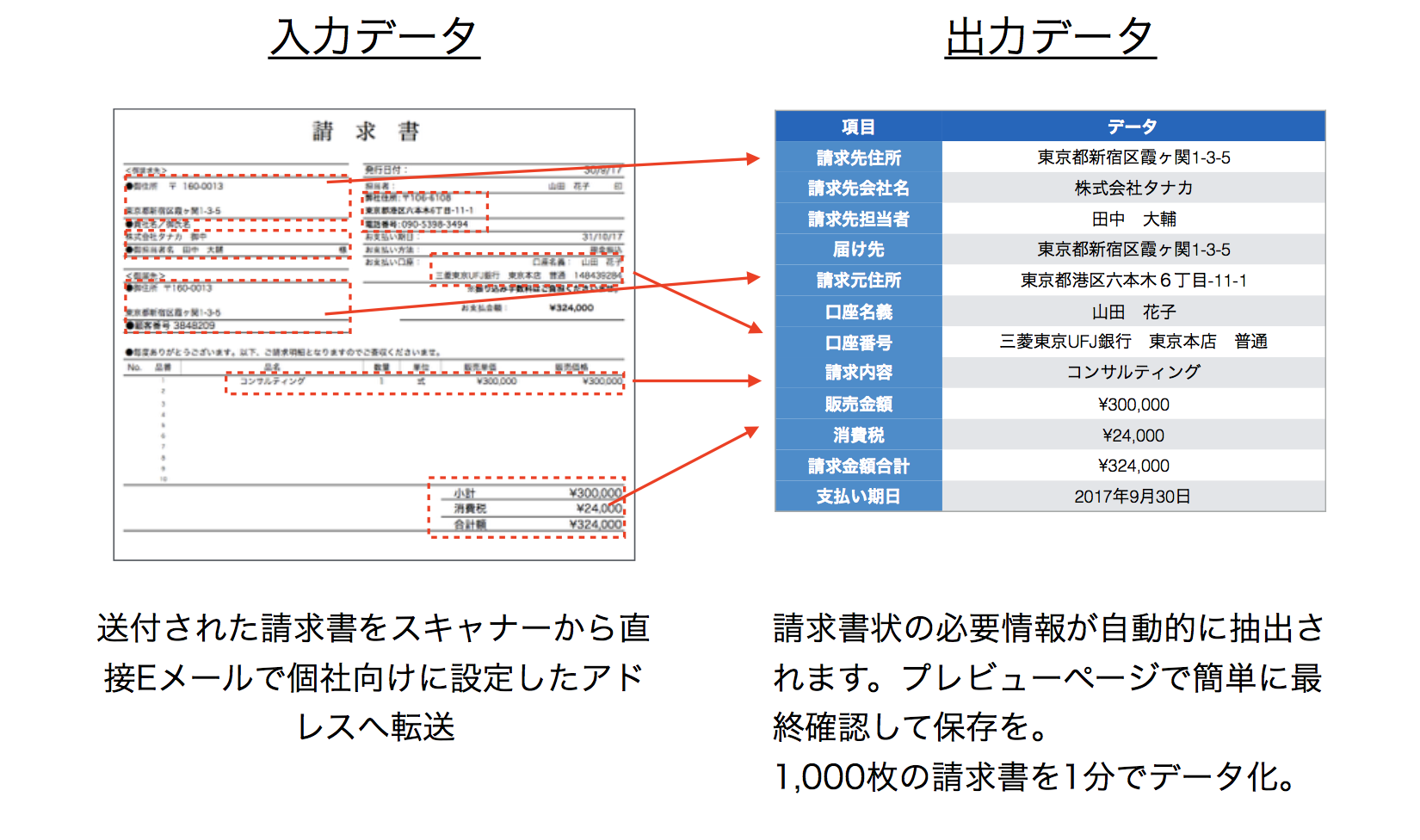 Flax Scannerは、申請書、ドキュメントやEメールから情報を正確に抜き出し、データベースに自動で入力していくことができるシステムだ。社内で使用するような構造化されていないドキュメントやEメールの情報を意味理解し、構造化した上で整理し、管理システムに自動で入力するそう。日本語の手書き書類にも精度約99.2%で対応し、BPO(Business Process Outsourcing)と組み合わせることも可能だそうだ。