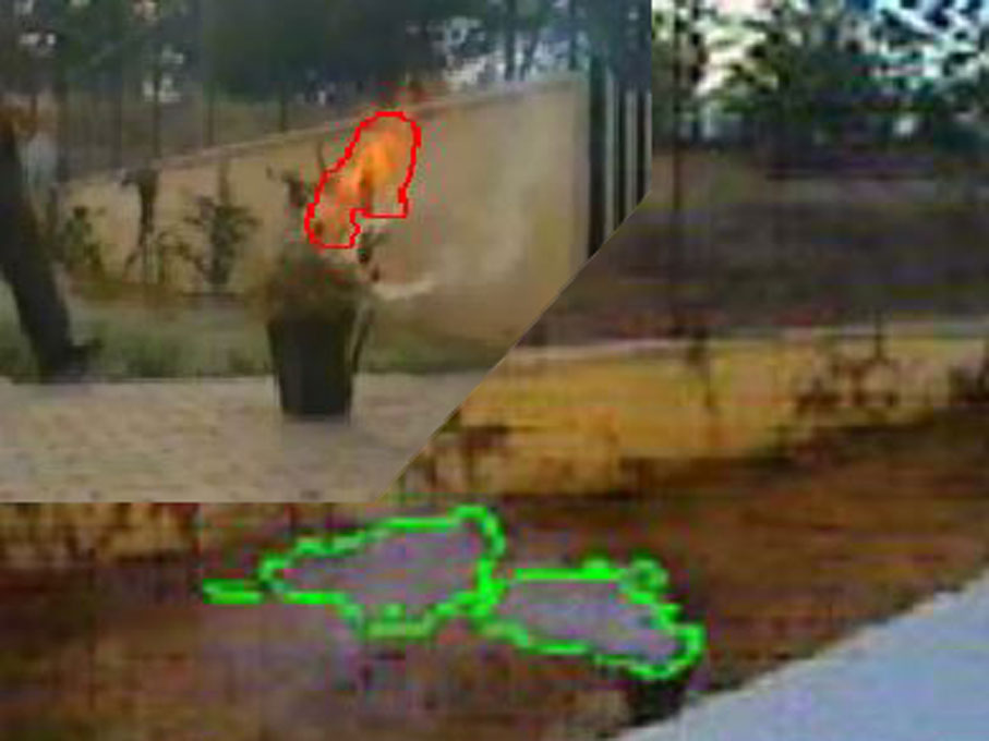 Ai Magicでは人工知能と画像認識技術を活用し、リアルタイムで車両・コンテナナンバーの認識、火災&煙、人の頭部、車両の検出に取り組んでいます。上にある画像は、火災&煙検出の実例結果写真です。色相情報だけに基づく従来の方法と異なり、火災・煙の動きと色相情報を結合し、火災・煙の後部領域を検出します。そしてモフォロジー処理のあと再検証し、火災・煙検出時に発生する誤検出領域を除去し、正確な火災および煙領域だけを検出します。都会やトンネルでもリアルタイムに検出できます。