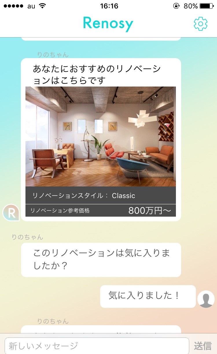 チャットボットで希望の物件を入力すると、物件を提案してくれます。そのあと、リノベーションのパターンを提案してくれます。