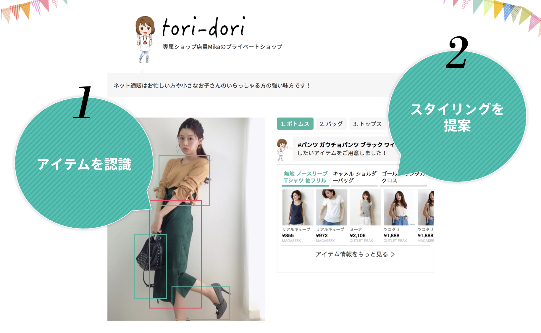 もう1つはスタイリングを自動で生成してくれる『人工知能ファッション店員Mika』。「そのアイテムに着合わせることがおすすめなのはこれです」という具合に、コーディネートを自動で提案します。