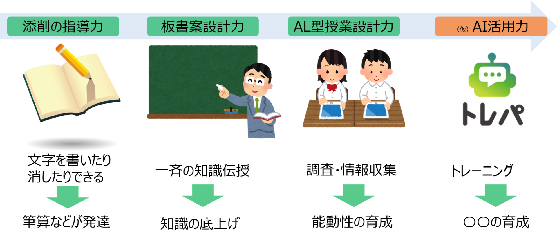 教員が、思い立ったら、すぐコンテンツを作れる―そんな「AIを誰もが簡単に使える社会」が、デジタル・ナレッジが考える(実現したい)「AIの未来像・その1」です。今までも様々なツールが生まれるたびに教育者に求められる力も変遷してきました。AI活用力も必要になってくるでしょう。