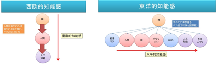 話題をキャラクターの人工知能に戻そう。西欧における知能に対する感覚(知能感)と東洋における知能に対する感覚は異なる西欧は「神-人間-人工知能」の絶対的な垂直の序列がある。だからこそ人工知能は必ず命令されるサーバントとしての立場にいる。一方、東洋的知能感は水平的である。「八百万の神」の感覚、森羅万象が押し並べてあるという感覚であるから、人工知能はむしろ自分たちと同列にあるものと捉えたいと願う。