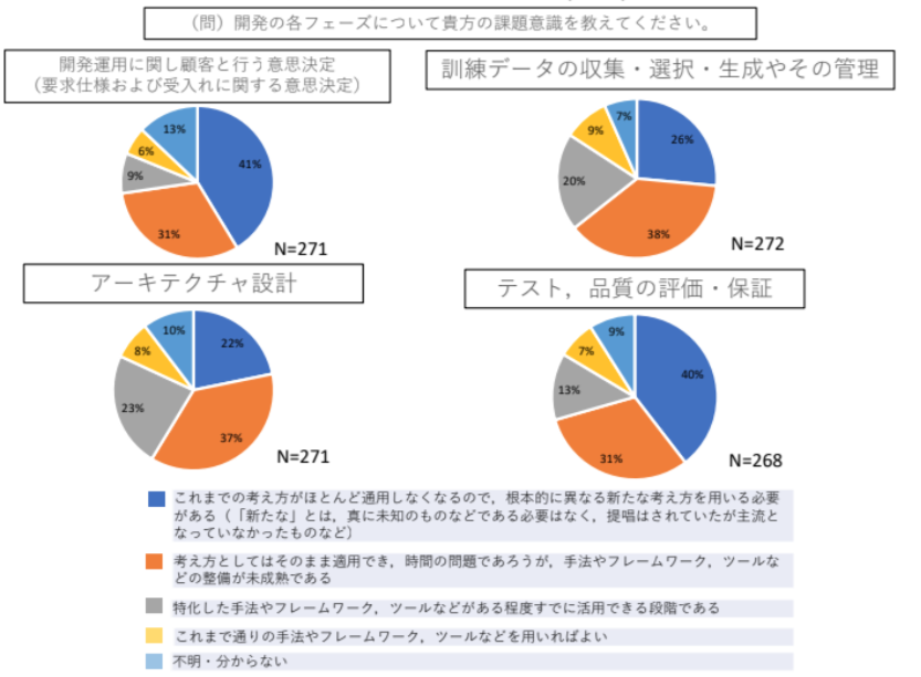MLSEが行ったアンケートの中で、機械学習に関する課題意識についても調査されています。この結果を通して浮き彫りになったのは、「要求仕様やシステムの受け入れに関する意思決定」や「テスト、品質の評価や保証」について根本的に異なる新たな考え方を用いる必要があるという意識が強いということです。
