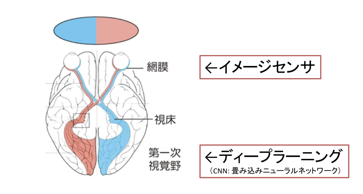 人間の眼は網膜を通して映像の情報を取り入れ、視床を通じて第一次視覚野で認識しています。これをディープラーニングで置き換えると、カメラなどのイメージセンサで映像を得て、インターネット回線で情報を伝達し、ディープラーニングの部分で認識すると言えます。