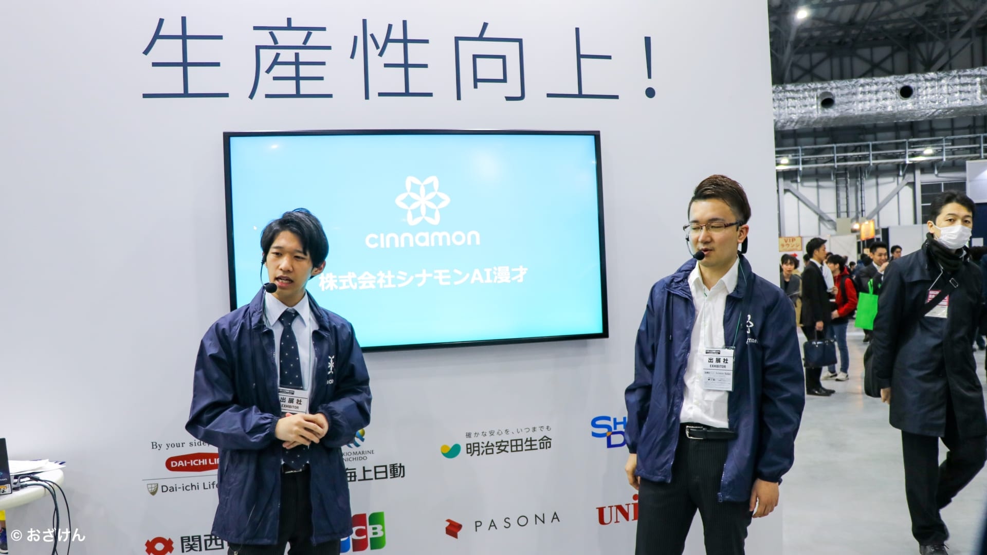 音声認識エンジン「Rossa Voice」やOCRツール「Flax Scanner」を提供する株式会社シナモンは、漫才師を活用した商品紹介を実施。独自の視点でシナモンのツールを紹介する独特なブースを展開していました。