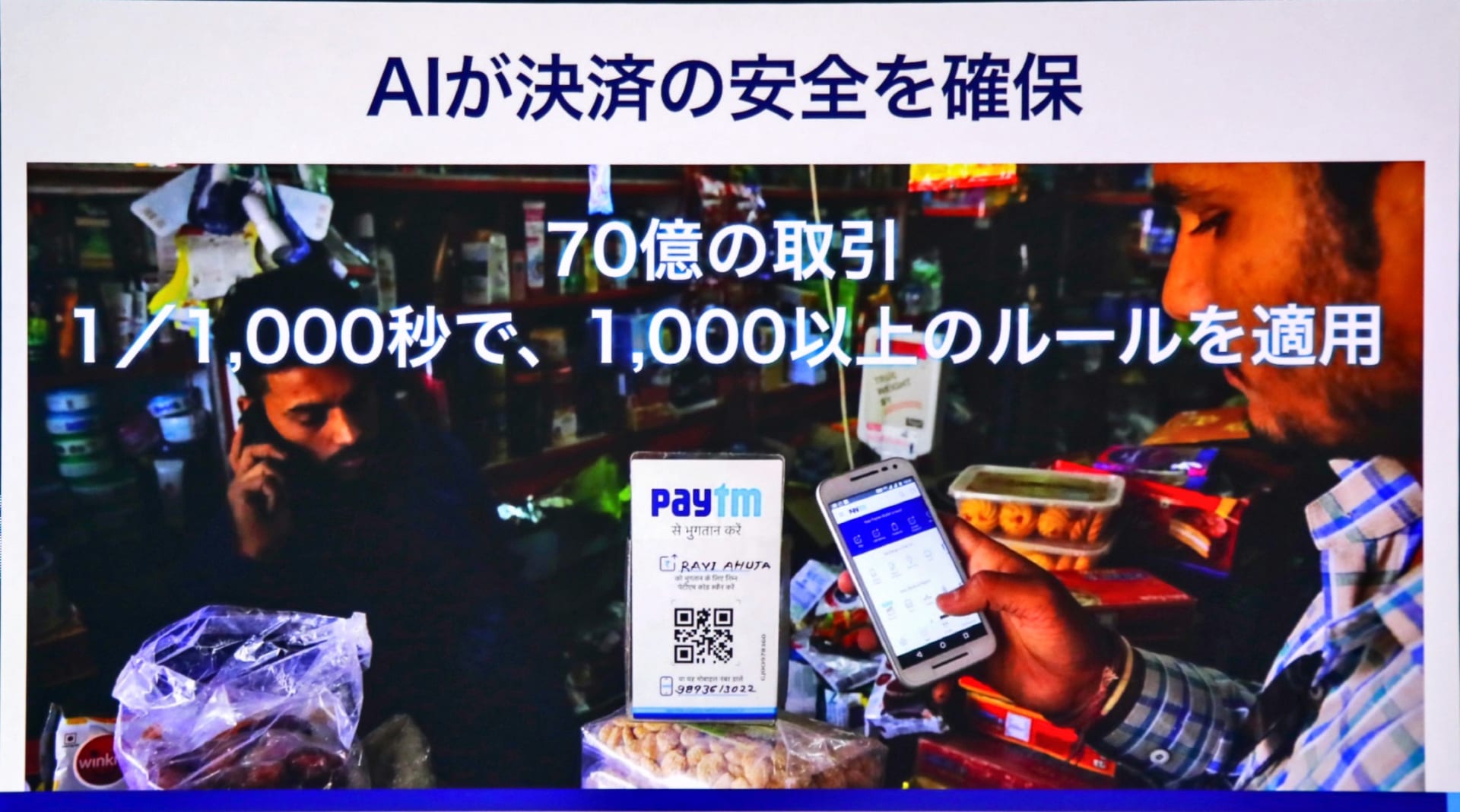 また、決済の安全性の担保にも、AIを活用しています。70億の取引に対して、わずか1000分の1秒で1000以上のルールを適用して、決済の管理を行っています。