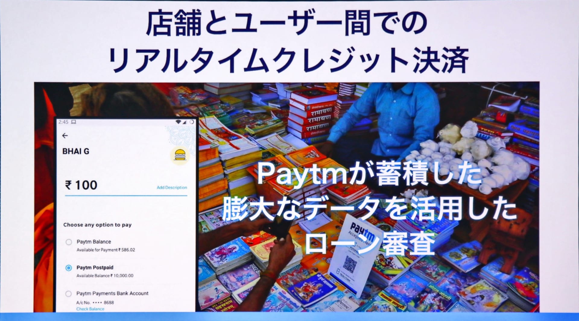 例えば、店舗とユーザ間のリアルタイムクレジット決済では、Paytmが蓄積した膨大なデータを活用し、ローン審査をおこっています。