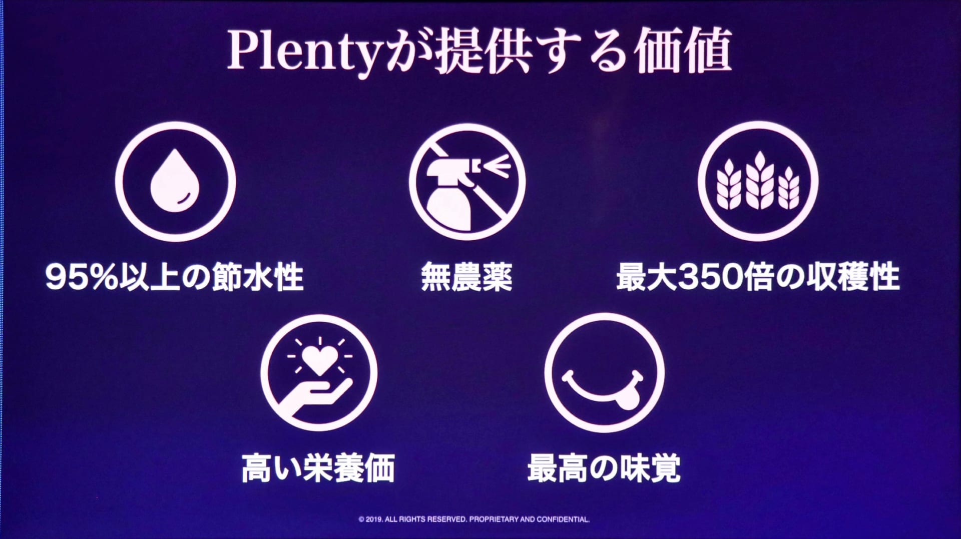 Plentyの技術を活用すれば、例えばカリフォルニアで栽培されるケールの50%が枯れてしまっても、栽培方式を調整することで需要に合った供給を行うことができます。21世紀の最大の社会課題でもある食糧不足の問題を、AIの力で解決しようとする、まさに先進的な取り組みです。