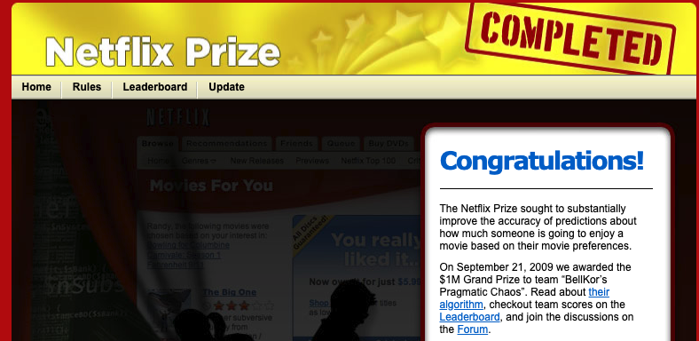 以上の疑問に答えるにあたり、Netflixがあの有名な100万ドルの賞金がかかったチャレンジを発表した2006年を振り返ると多くのことがわかる。この賞金レースではNetflixが記録していた二乗平均平方根誤差0.9525が、最終的には0.8572あるいはさらに小さい値によって打ち負かされた。チャレンジの焦点が二乗平均平方根誤差(※訳注6)だったのでヒトビトはそれだけに焦点を合わせ、チャレンジによる影響は今日に至るまで続いている。
