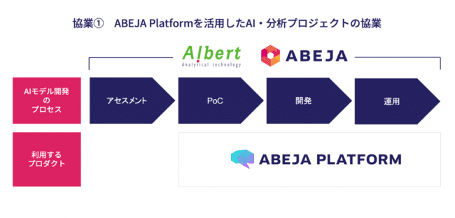 ABEJAのABEJA PlatformをALBERTに提供。 ALBERTは、 ABEJAの顧客の一部に対して、 顧客ごとに最適なAI・分析プロジェクトの推進を支援します。 また、 ALBERTの顧客と取り組むプロジェクトでは、 顧客ニーズに合わせてABEJA Platform上での開発・運用を行うことが可能に。この取組みにより、 短期間で顧客にAIモデルの提供ができるほか、 AIの本番運用で必要不可欠な継続的なモデル改善のプロセスを最適化することが可能になります。