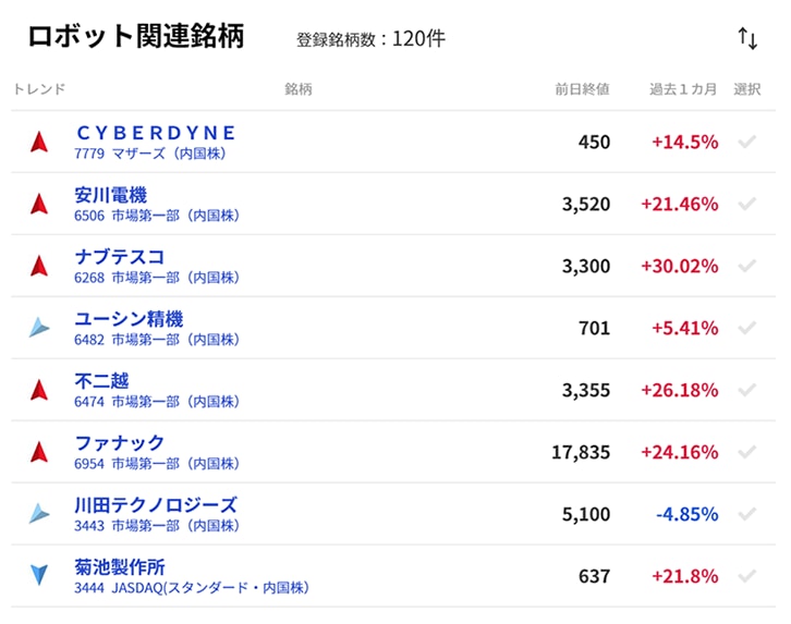 AIが過去の株価などのデータから、1か月後の株価が上昇するか下落するかを銘柄ごとに予測します。