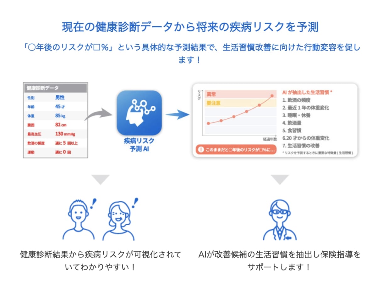 予測結果は数値で具体的に表されるため、ユーザーの生活習慣改善に向けた行動変容につながります。さらに、AIによって抽出された改善候補の生活習慣を、健康指導医によって実際の保健指導に生かすことも可能です。