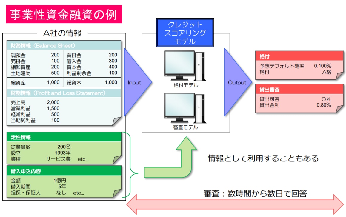 近年、「クレジット・スコアリング・モデル」に機械学習アルゴリズムを採用することが広まりつつあります。クレジット・スコアリング・モデルとは、個人や企業の情報から信用リスクをスコア化する仕組みのことで、銀行の貸付審査などで利用されています。