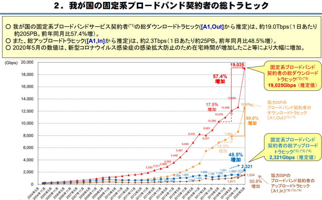 総務省の調査によると、2020年上半期の固定ブロードバンド系サービス(光回線など)の契約者の総ダウンロードトラヒックは一日あたり約205PB(≒約2億GB)、総アップロードトラヒックは一日あたり約25PBとされています。もはや想像すらできない量の情報が日々ネット上でやりとりされていることがわかります。