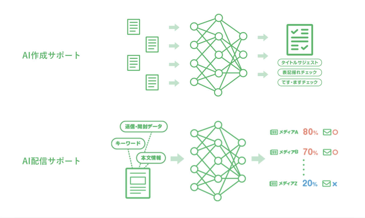 特に、プレスリリースの作成では、独自のAI文章サポートが最適なタイトルを提案、校閲し、届けるべき最適なメディアもAIが自動選定します。