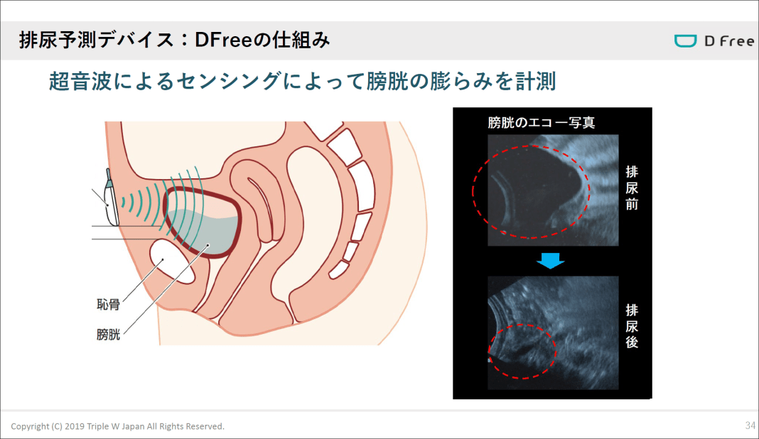中西:排泄予測デバイスの「DFree」を販売しております。排泄はここにいらっしゃる皆さん全員に関係する問題ですね。画期的な点を一言でいえば、超音波技術をウェアラブルデバイスに落とし込んだ、という点になります。