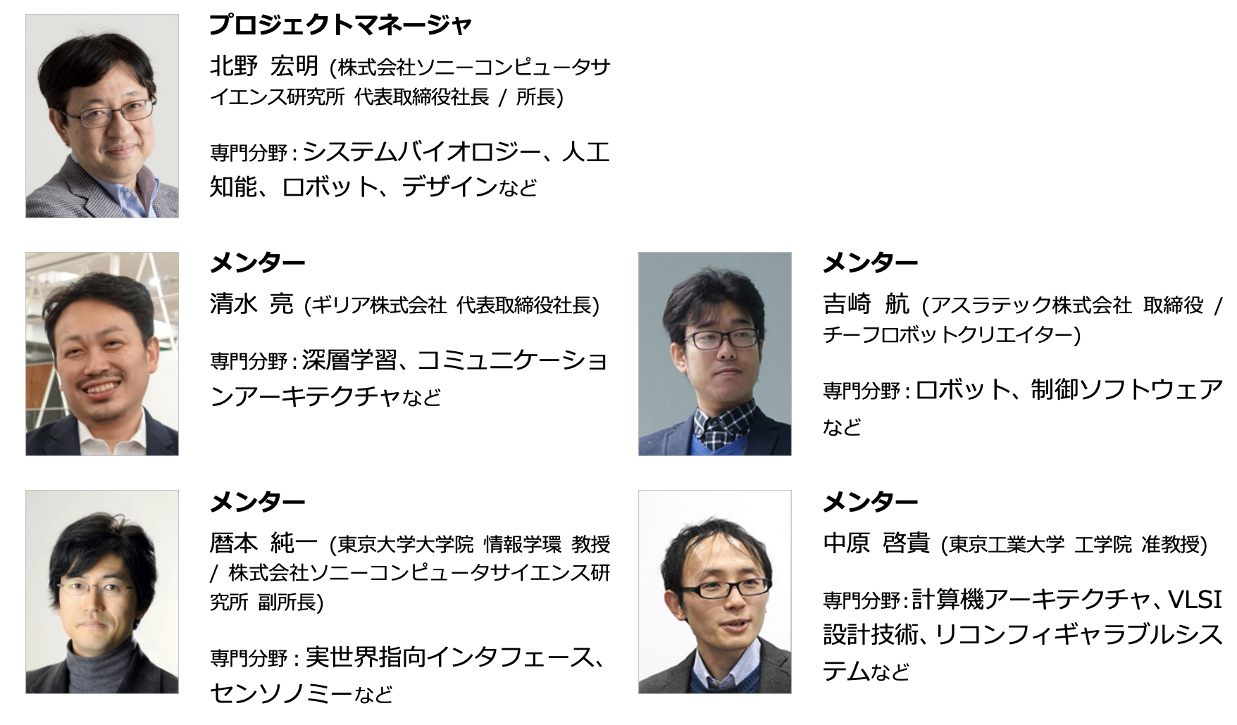 AIフロンティアプログラムでは、人材の発掘・育成全般を統括するプロジェクトマネージャ、育成対象者に対する助言やサポートを手がけるメンターとして、以下の方が協力しています。