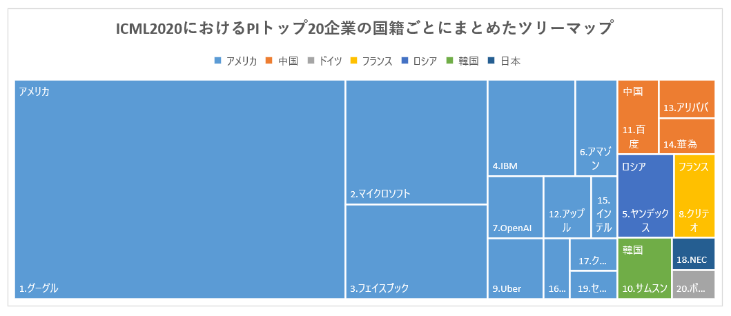 また、トップ50機関に関して国籍を親構造としてツリーマップを作成すると、以下のようになる。グーグルは、1企業だけでランキング下位の国のパブリケーション・インデックスを凌駕する。