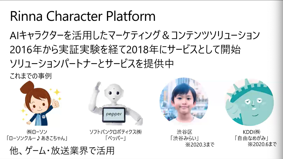 AI「りんな」は、 共感をテーマに、 AIと人の間に感情のつながりを築くことを目的として、 マイクロソフトの開発部門であるAI&リサーチで開発され、 2015年8月にLINEの公式アカウントとしてサービスの提供を開始しました。 サービスの提供開始当初より、 さまざまな企業から、 自社キャラクターに「りんな」のテクノロジーを活用したいという要望があり、2016年からローソンと実証実験を開始し、 2018年に「Rinna Character Platform(RCP)」のサービスを開始しています。
