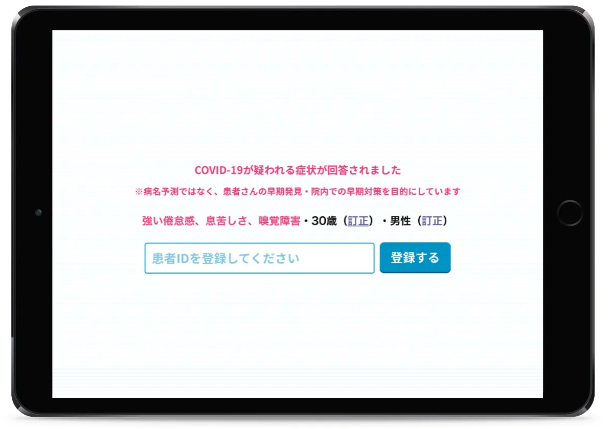 新たに導入されたCOVID-19症状アラートは、患者が新型コロナウイルス感染の疑いのある症状を回答した場合、医師や看護師に警告を出し、院内感染の防止を進めます。