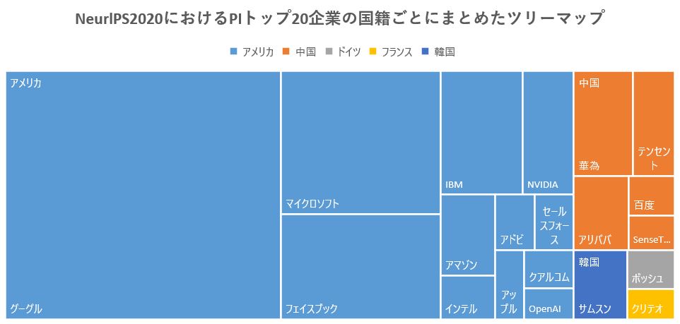 また、国籍を親階層としてツリーマップを作成すると、以下のようになる。Googleのみで2位以下の国の企業の合計より大きいシェアを占めている。