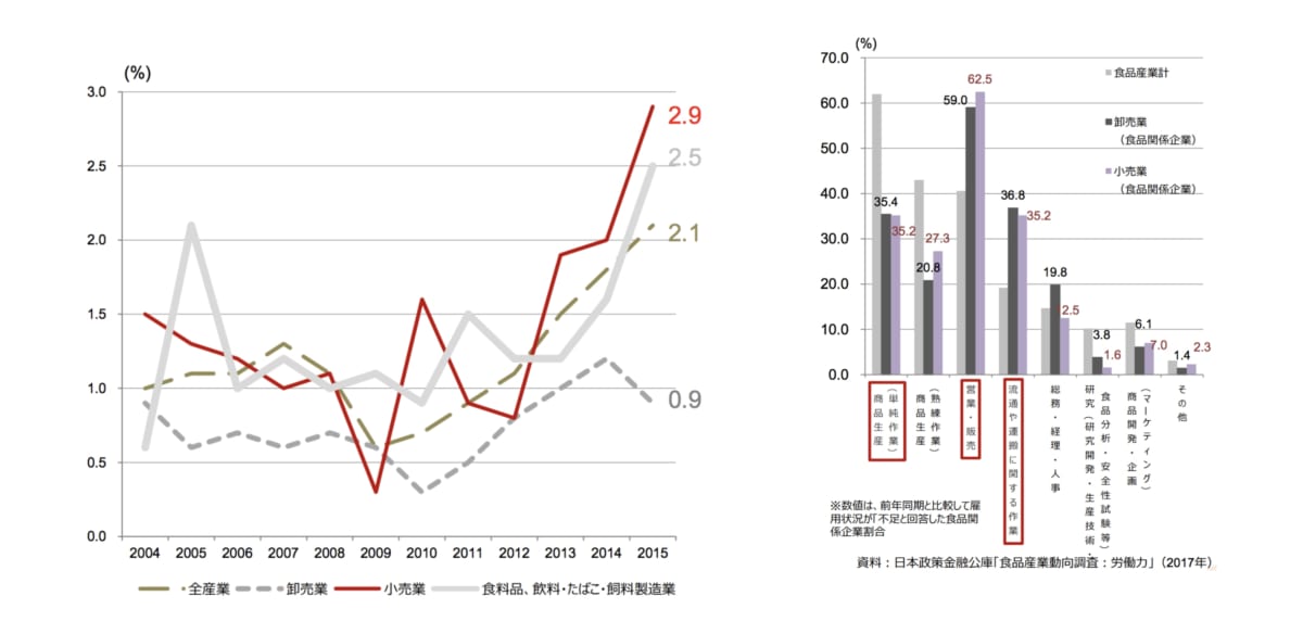 農林水産省が平成30年発表した「卸売業・小売業における働き方の現状と課題について」のレポートによると、小売業の欠員率は食品製造業をも上回る水準となっており、深刻な人手不足の課題に直面しています。特に「営業・販売」、「流通・運搬作業」、「商品生産(単純作業)」で労働力不足が見受けられます。