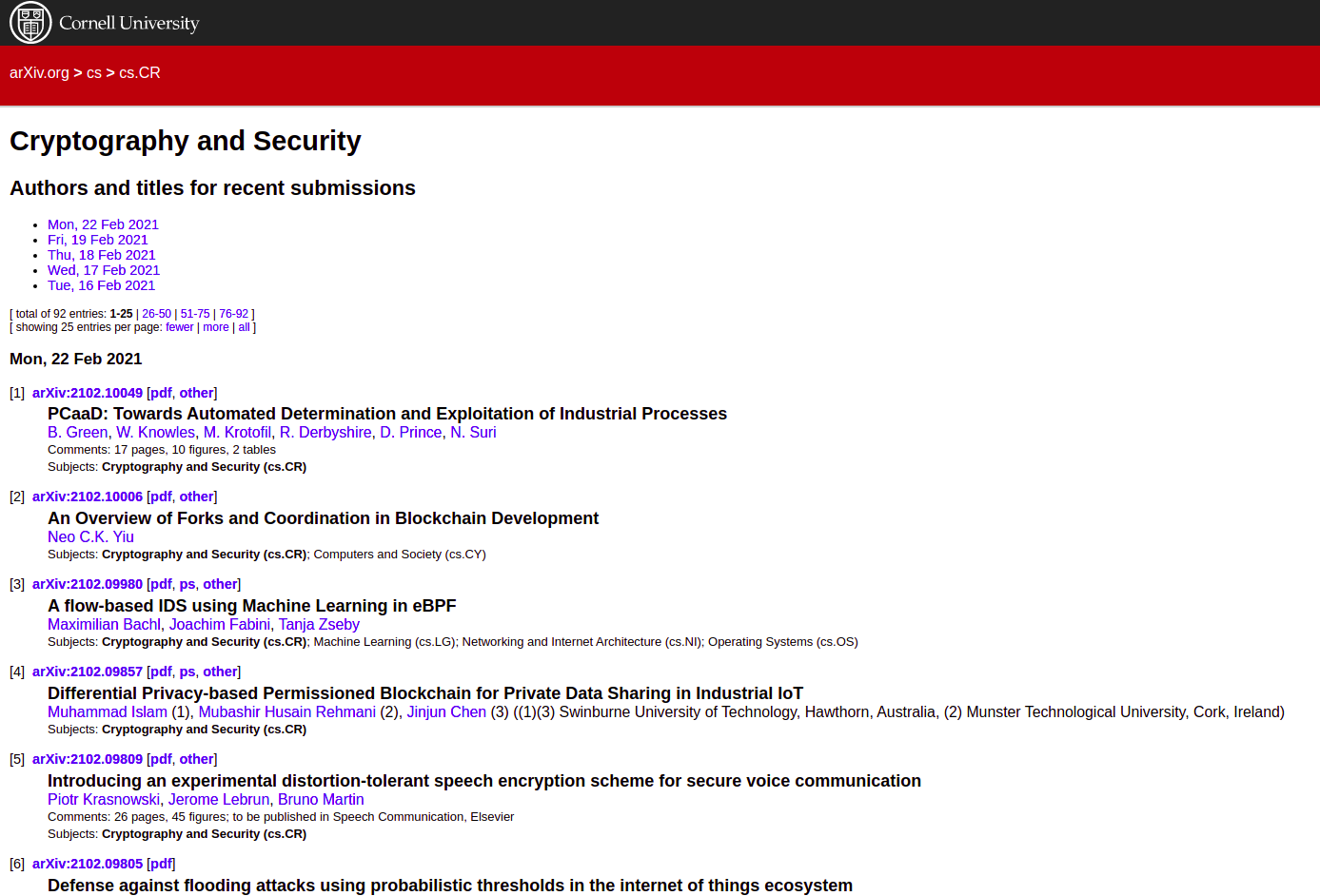 このarXivの中で、筆者らがAIへの攻撃手法と対策の情報源として活用しているページが「Cryptography and Security」です。このページには、サイバーセキュリティに関する論文がほぼ毎日十数本掲載されており、攻撃検知やマルウェア検知などのセキュリティ・タスクにAIを活用した研究や、AIに対する攻撃手法と対策に関する研究論文も数多く投稿されています。