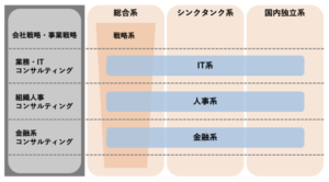 IT系コンサルティングは、ITを切り口に顧客のビジネス・経営に関わるソリューションを提供するファームです。IT戦略、ERP、CRM、SCMの導入から、情報処理システムの構築・保守まで企業経営におけるIT全般を担います。