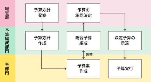 各部門の予算案を作成後各部門の予算案を予算編成部門で取りまとめて総合案を作り、上層部の承認が下りたら各部門で予算を実行する流れです。