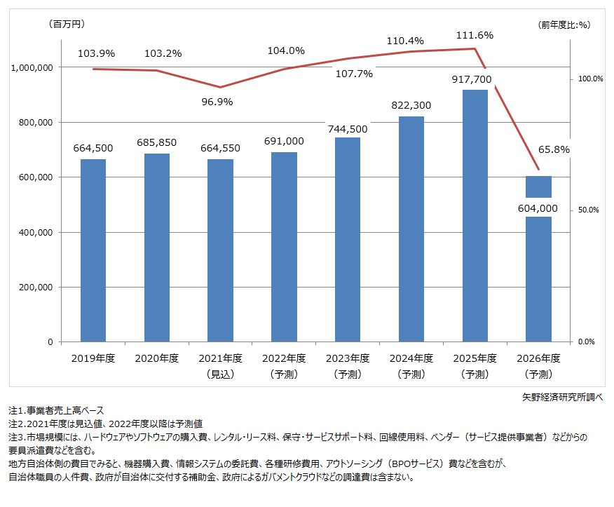 2021年度は、基幹系システムに関しては引き続き標準化対応を前にした見送りが続いていることに加え、コロナ禍関連の需要も2020年度からは減少したため、2021年度の同市場規模は前年度比3.1%減の6,645億5,000万円になる見込みとされました。
