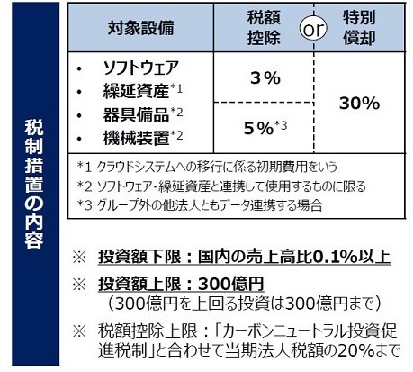 DX推進のためのソフトウェア・繰延資産・器具備品・機械装置といった設備投資の費用にかかる税額を、税額控除もしくは特別償却という形で減額することで、企業のDX投資を促進しようという政府の狙いがうかがえます。
