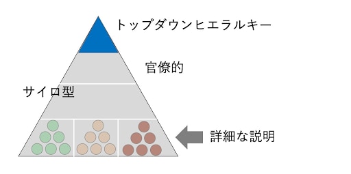 アジャイル型組織に対して、従来の組織をピラミッド型組織と呼びます。ピラミッド型組織は、人材を効率的に動かすことが目的です。そのため、縦割りと表現されるように、指示は立場が上のものから下に流れるだけであり、上からの指示を実現する集団が一つひとつ形成されています。