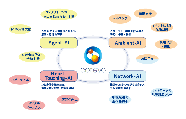 「corevo(コレボ)」は、上図の4つのAI技術を核として、ビジネス分野、交通分野、インフラ分野、ヘルスケア分野、ライフサポート分野といった各分野での社会実装を推し進めています。