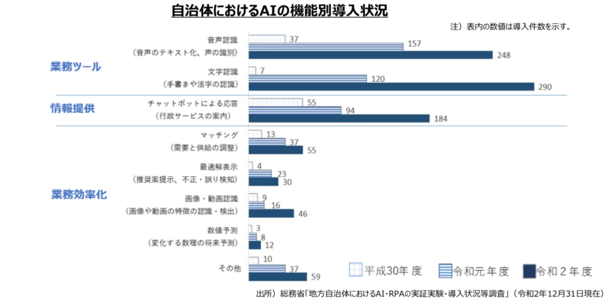 特に地方自治体では、新型コロナウイルスの感染拡大下で増加する住民への対応業務の負荷を軽減するために、チャットボットやAI-OCRの活用が進んでいます。下図のように自治体におけるAIツールの導入は、文字認識・音声認識を中心に年々活用が進んでいます。