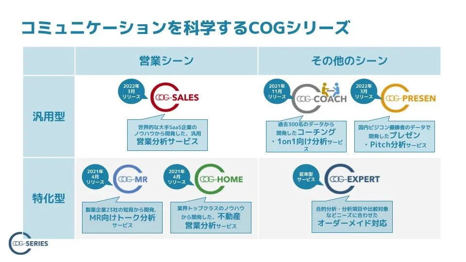 コグニティ株式会社は独自のAIで科学的にコミュニケーションを分析する「COGシリーズ」を展開中です。これまでに業界特化型や用途特化型サービスをリリースし、2022年4月現在までに国内250社・4万人以上に利用されています。営業トークや昨今導入が進む1on1など、コミュニケーションについて定量化・質の「見える化」が可能となり、フェアな評価arimasenndesitaと人材育成が実現します。今回の分析にはプレゼンやピッチに特化した「COG-PRESEN」が使用されました。