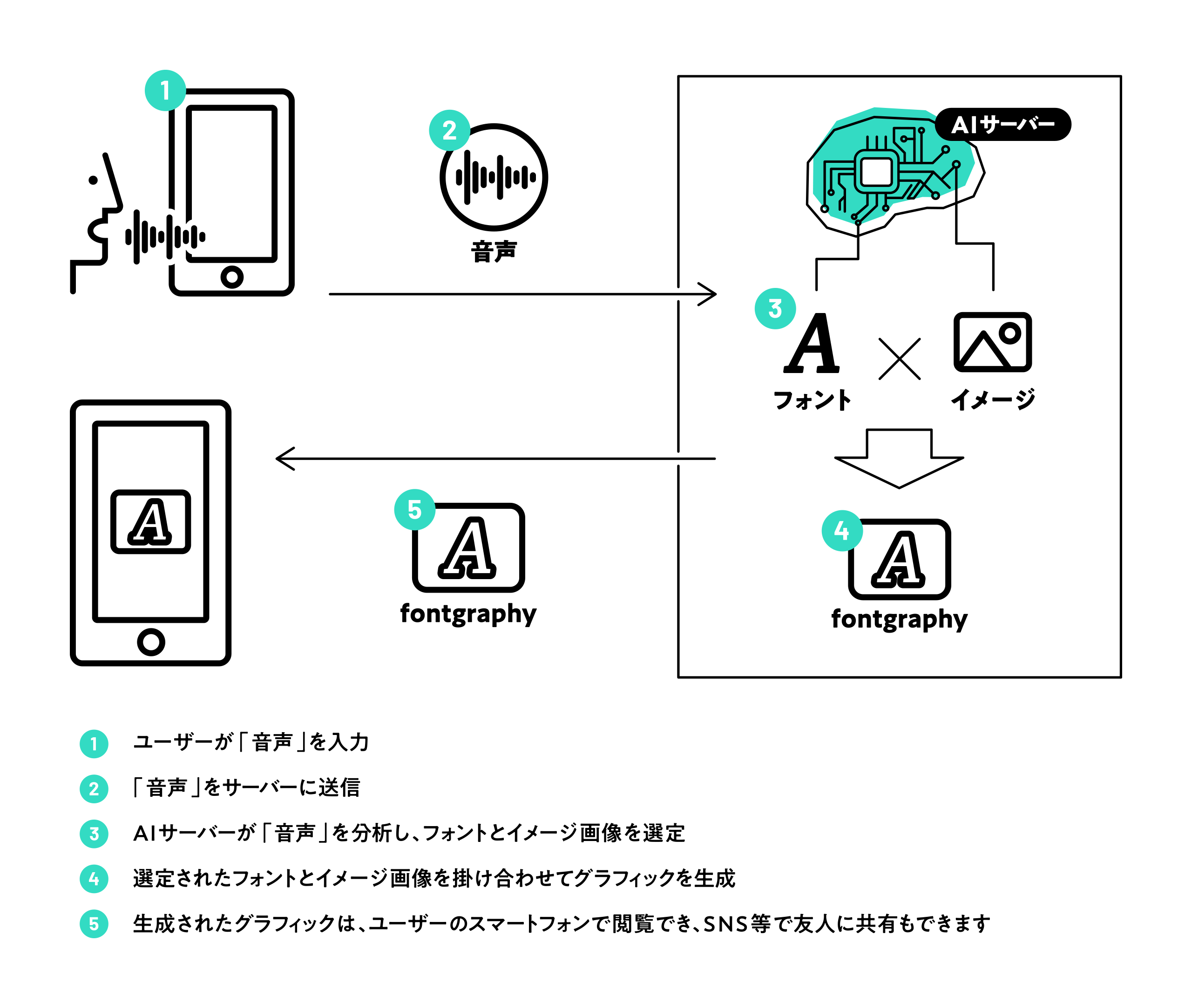 fontgraphyは、スマートフォンに話しかけるだけで、AIが声質を分析し、その分析結果によって「DNP」の文字のフォントとイメージ画像を選定します。その2つを掛け合わせることで、話者一人ひとりに合わせたオリジナルのロゴを生成します。