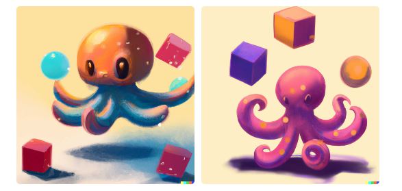 • 手順1:ロゴの大まかなイメージをプロンプト入力文で表現して(例えば「データベースに関する図表をジャグリングするタコの赤ちゃん」)、DALL-E 2に渡す。