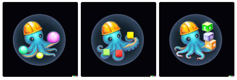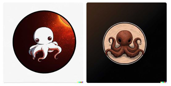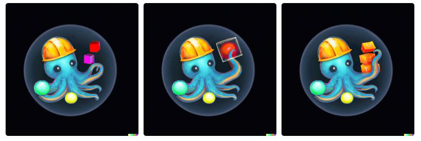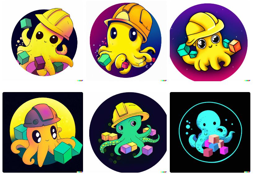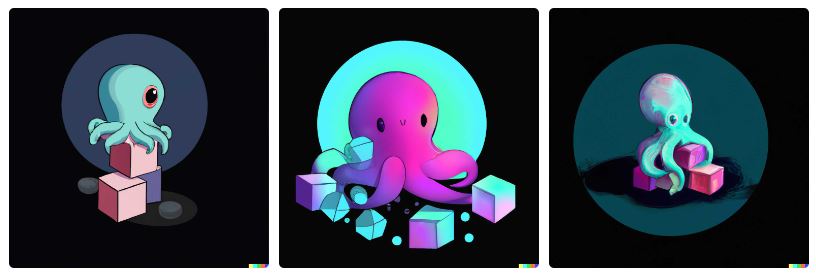 こうして記事冒頭で見たようた中央の画像が採用された。立方体の中に球体が入っているのは面白いし、タコはいくつかの物体を操っているし、ロゴマークっぽいし、なかなかかわいいし、(何らかの)信頼感を抱かせるし、小さい要素がないから遠目で見てもいい感じだ。