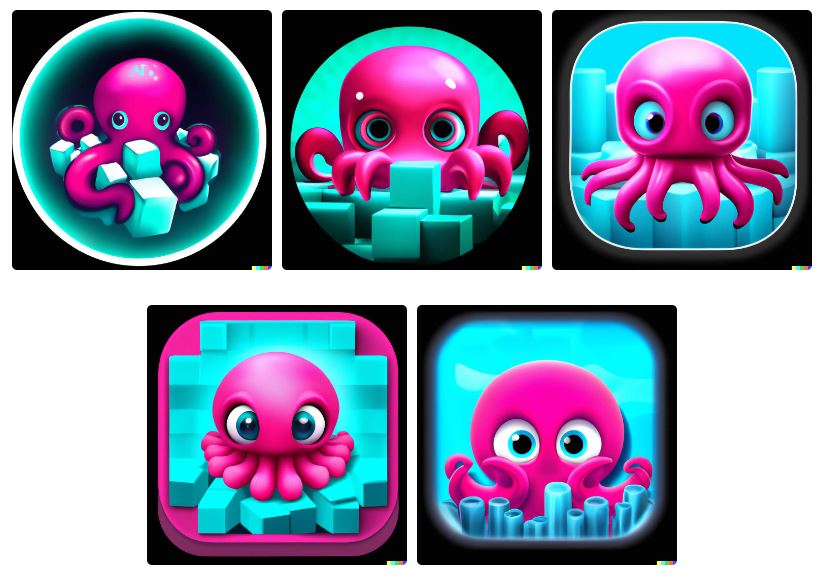 以上のプロンプト入力文を元にバリエーションを連鎖させていくと、素敵なタコとヤバいタコ、それからたくさんのアプリアイコンが出来上がった。