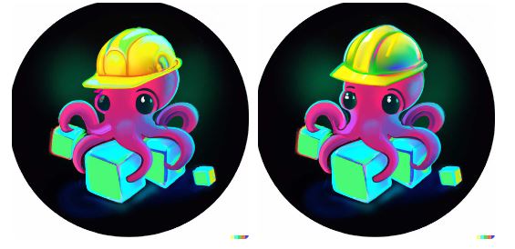 以上の出力は、まだ本当に素晴らしい方向には向かっていない。ならばオリジナルの入力文を編集して、私たちのニーズに合うようにできるかも知れない。今のところ、出力画像はとても遊び心がある。しかし、OctoSQLは本格的にデータを処理するためのものであり、ロゴはそうしたアプリの機能を反映したものであるべきだ。そして白状してしまうと、黄色の安全ヘルメット以上に信頼を抱かせるものが思いつかなかったので(正直なところ、ヘルメットは明らかにロゴとして使いやすい)、それを加えてみよう。