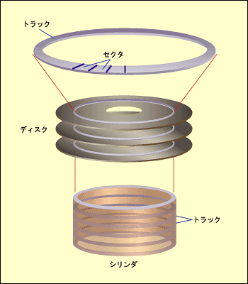 (※訳註7)シリンダとは、IT用語辞典 e-Wordsによると「円筒、円柱という意味の英単語。磁気ディスク記憶装置の記録単位の一つで、複数のディスクの同じトラックをまとめた領域」である。図解すると、以下の画像のようになる。