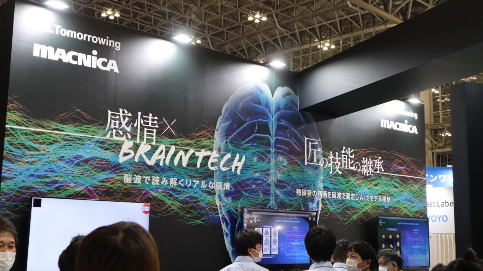 ブース内では、実際に脳波をはかる体験ができました。体験では、脳波をはかりながら一秒に6枚映るレモンの画像をみて、腐っているレモンの画像だけを数えていくのですが、腐ったレモンの画像を見た時だけ脳波が強く反応するので、不良品判別に活用できるそうです。体験で装着した器具はヘッドフォンに近い形でしたが、現在シール型が開発されているそうです。