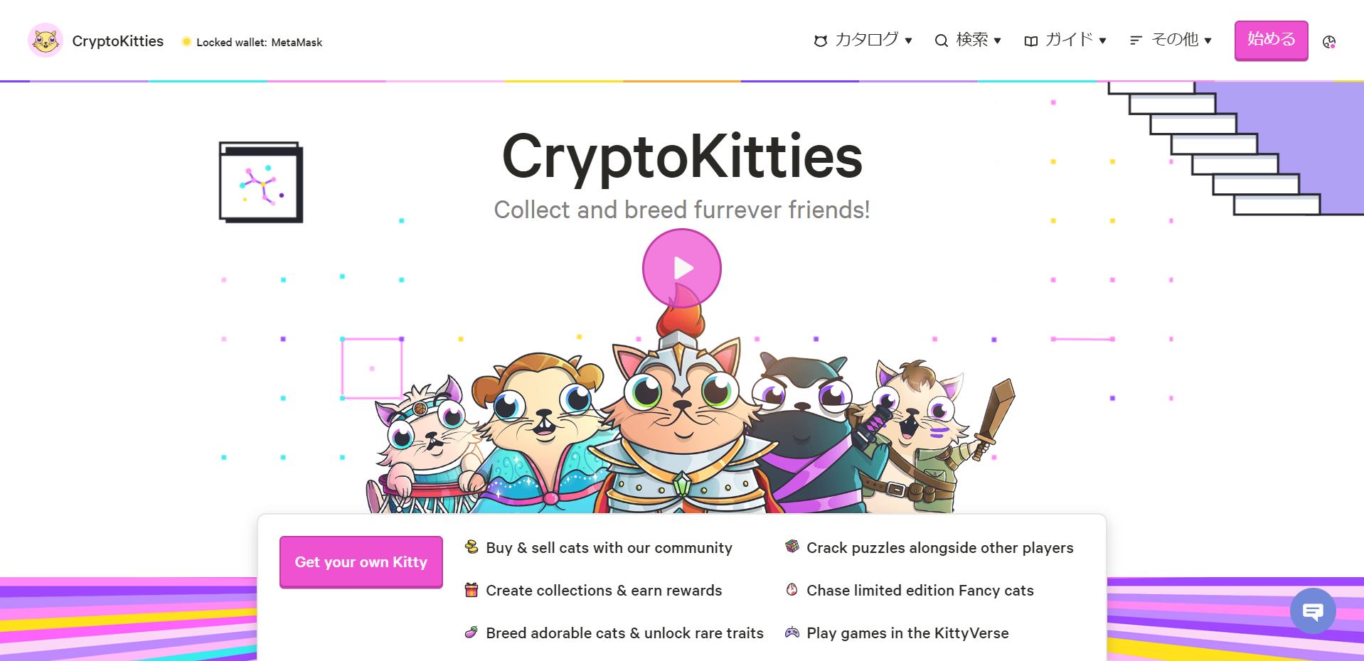 CryptoKittiesは、かわいい猫たちと遊びながらコレクションや投資が楽しめるNFTゲームです。