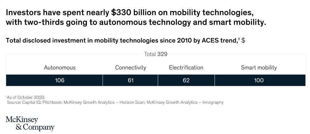 アメリカにおける2010年以降の自動運転関連技術への投資を図示したグラフ。画像出典:マッキンゼー作成レポート
