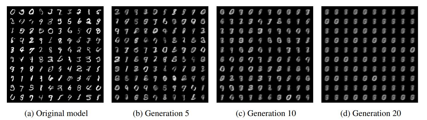 「モデルによって生成されたコンテンツを訓練に使用すると、結果として得られるモデルに不可逆的な欠陥が生じることがわかった。オリジナルコンテンツの分布の尾が消えるのだ。我々はこの効果をモデル崩壊と呼び、すべての学習済み生成モデルにおいて(それが)偏在していることを示す。ウェブからかき集めた大規模データから学習する利点を維持するためには、この効果を真剣に考慮する必要があることを示す。」